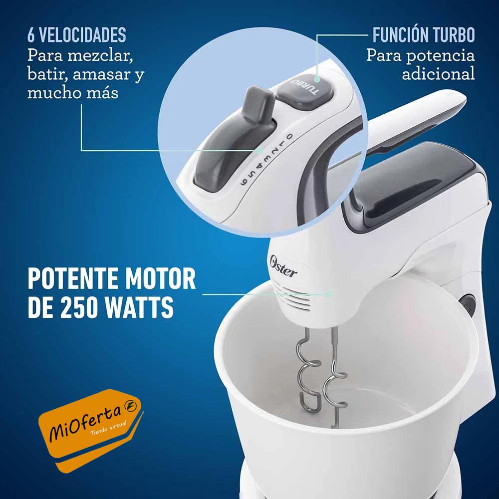 La batidora de mano y pedestal Oster con tazón de plástico cuenta con una acción giratoria única, para mezclar 2 veces más rápido y uniforme. Sus 6 velocidades y la función de Turbo ofrecen potencia adicional y te permite preparar desde gruesas masas de galletas hasta delicados merengues. Su tazón de plástico blanco no sólo es conveniente sino atractivo a la vez, para batir o amasar, esta batidora te hará la tarea mucho más sencilla.