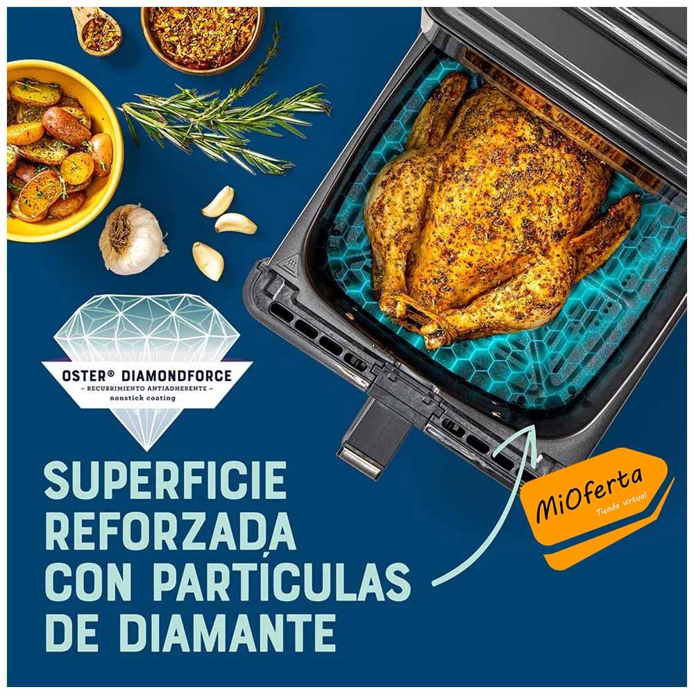 Ahora con la innovadora freidora de aire Oster con recubrimiento DiamondForce puedes crear una variedad de comidas deliciosas y súper saludables. Su tecnología DiamondForce se basa en un revestimiento de las rejillas reforzado e infundido con partículas de diamante que forman una matriz estructural que la hace 12 veces más duradero y resistente a rayaduras y hasta 15 veces más fácil de limpiar y un rendimiento superior a lo largo del tiempo.