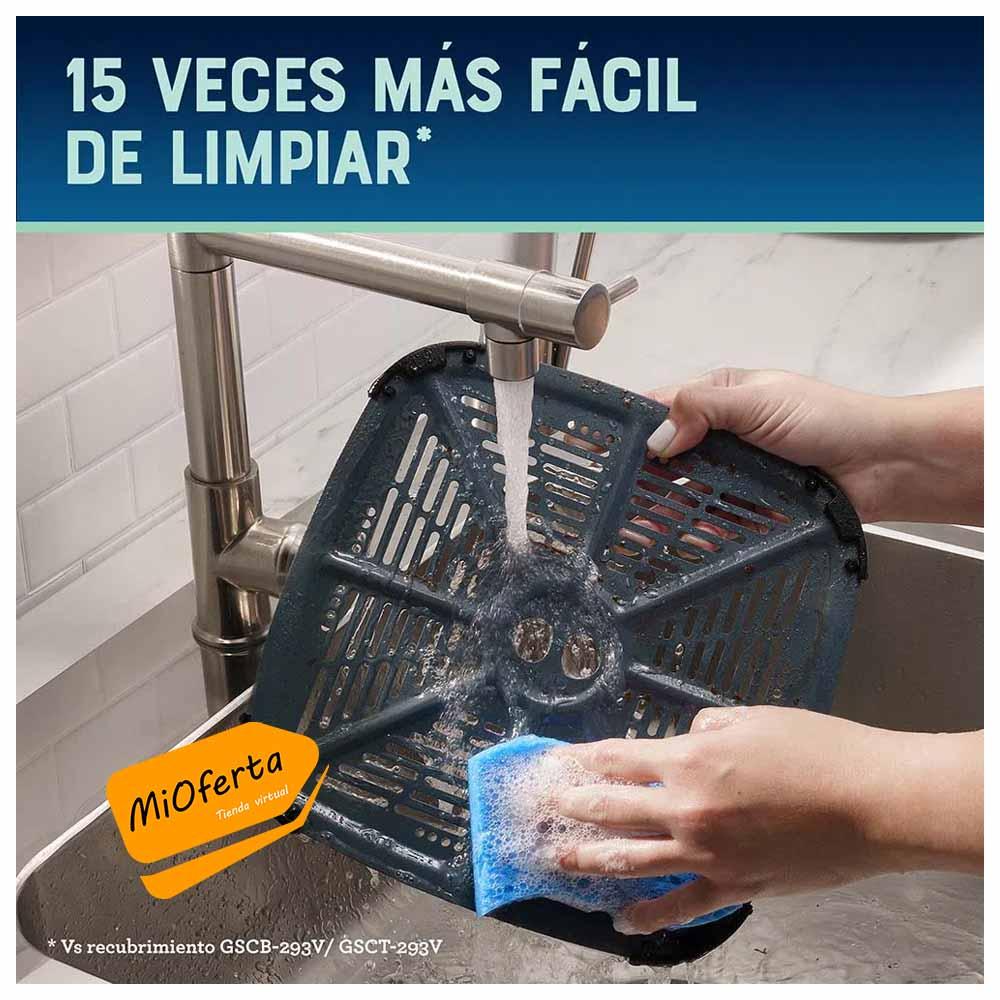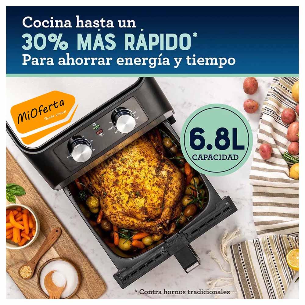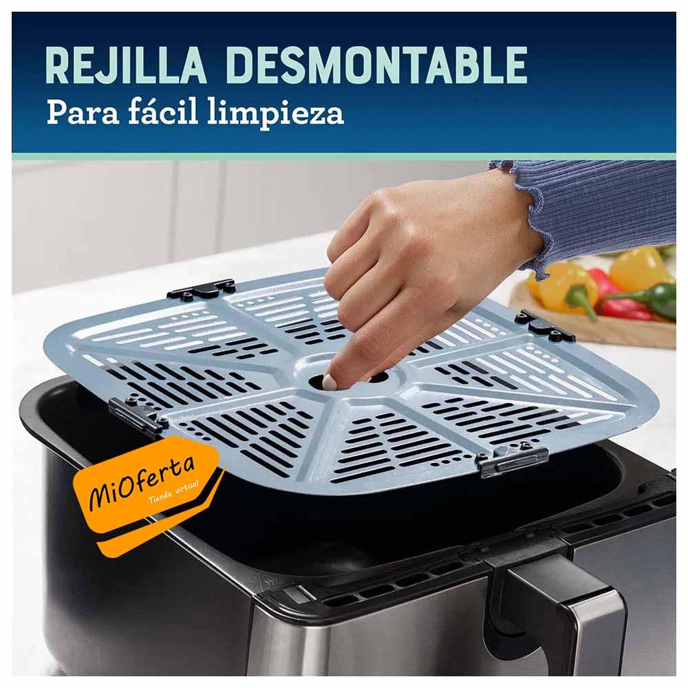 También cuenta con una bandeja desmontable que te permite preparar tus comidas favoritas: desde carnes jugosas, verduras mixtas y postres deliciosos, hasta un pollo entero de 2.5 Kg. Además la innovadora función de freír con aire usa un 99.5% menos aceite, o cual asegura alimentos mucho más sanos y saludables.