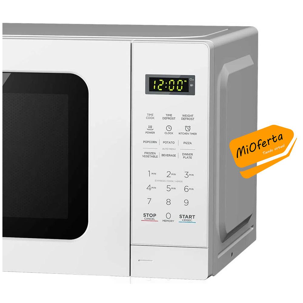 El horno microondas POGME2701 de la marca Oster simplificará la cocción, calentamiento y descongelamiento de tus alimentos para que pases menos tiempo en la cocina. Este horno eléctrico cuenta con una gran potencia de 700 watts, funciona con voltaje de 220 V, posee una capacidad de 20 litros, panel digital por el cual puedes seleccionar entre sus 6 programas automáticos pop corn, papas fritas, pizza entre otros. Gracias a su sólida estructura de metal color blanco, garantiza una larga duración del producto y dará un toque encantador a tu cocina.