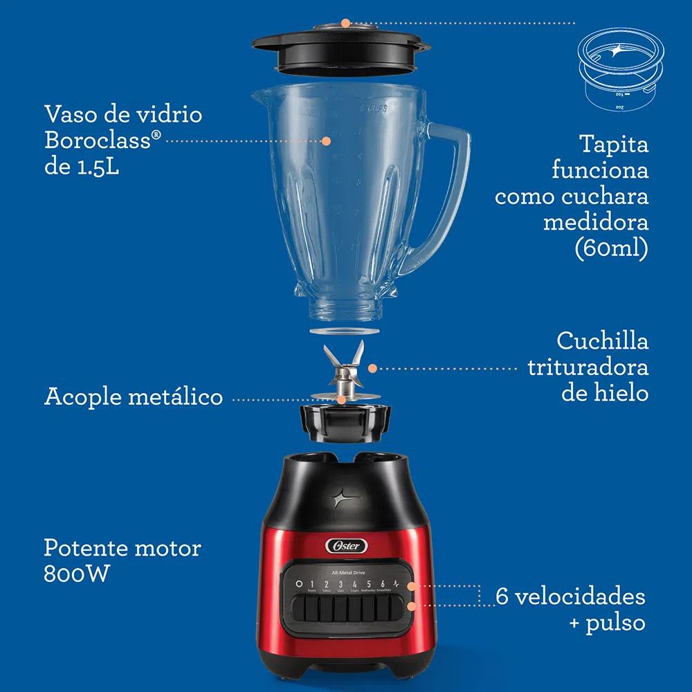 La Nueva Licuadoras Oster 6 velocidades más pulso son un sistema de licuado que lo tiene todo y de color Rojo, Cuentan con un poderoso motor 4 veces más duradero con 800 W de potencia pico y durabilidad comprobada de hasta 10.000 licuados. Su vaso de vidrio refractario Boroclass es resistente a ingredientes hirviendo**. Además, tiene una revolucionaria cuchilla 100% de acero quirúrgico que pulveriza hielo y muele granos, no se oxida ni gotea. El acople 100% metálico es 10 veces más fuerte***, que resiste el desgaste generado por la fricción entre la base y la cuchilla, por lo que te brinda más durabilidad en tu licuadora y por lo que no tendrás ninguna dificultad procesando los ingredientes más duros. * Comparado con motor modelo PU5443127-6115-AL en pruebas de carga ** Hasa un choque térmico de 90°C *** Resistencia a la tracción de acero laminado en frío 1215 comparado con plástico PP