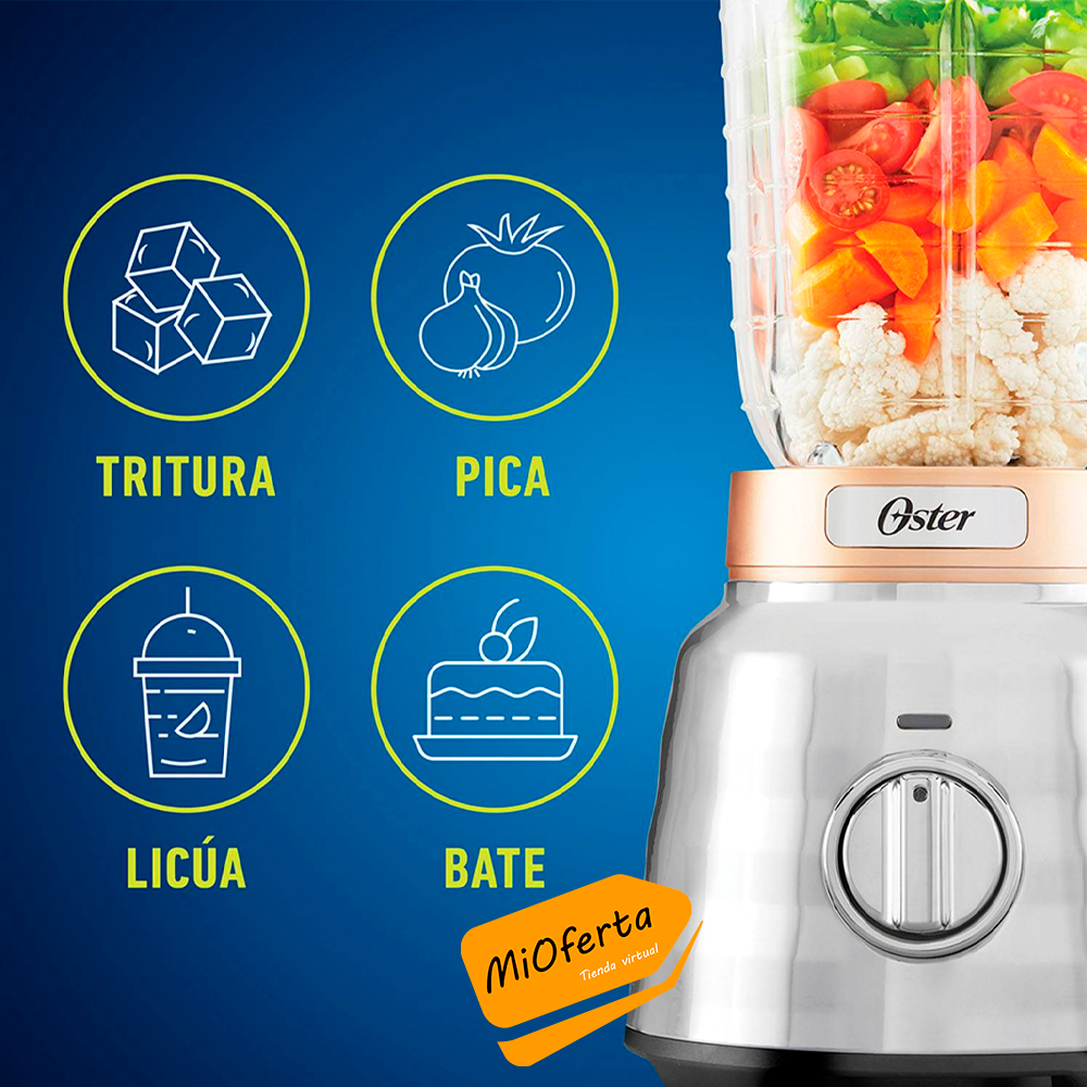 Inspirada en nuestra clásica licuadora Oster, este modelo BLSTPBRG es más duradero y poderoso. Su acabado metálico en la base es más elegante para un consumidor exigente como tú. El vaso tiene 40% más de capacidad, un motor de 2 caballos de fuerza de potencia pico y una cuchilla trituradora de hielo más grande que las regulares. Es una licuadora que te permite preparar día a día los más ricos platos, jugos y licuados con ingredientes duros o difíciles de mezclar. En ella puedes mezclar desde sopas y batidos, hasta jugos, muffins, salsas, sazonadores, tortas y muchas otras recetas. Lo que te provoque, lo puedes hacer de manera sencilla, fácil y agradable, obteniendo resultados profesionales. Es la licuadora que te da el poder para crear todo lo que imaginas.
