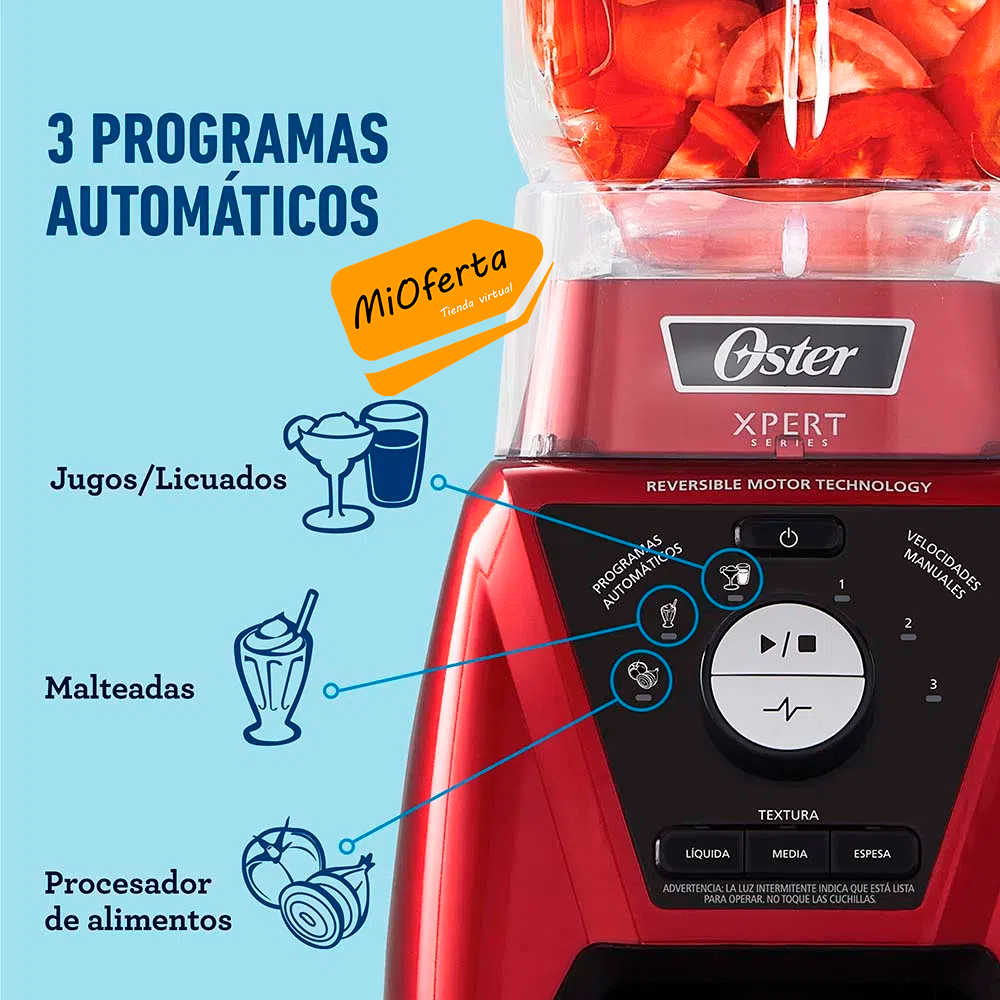 La licuadora Oster Xpert Series BLST3BRPG con control de textura personaliza la consistencia de espesa a líquida. Te da el poder de preparar todo lo que imaginas. A ti que disfrutas el sabor de los ingredientes frescos y saludables, esta es la licuadora que estabas esperando. La potencia del motor, la eficiente cuchilla, el acople totalmente metálico, los programas automáticos y el resistente vaso de vidrio, junto con el vaso Blend-N-Go de 750 mL, hacen que la tarea de la licuadora sea una experiencia única y satisfactoria. La licuadora Oster Xpert Series con control de textura funciona de forma automática, gracias a sus 3 programas que garantizan una velocidad y un tiempo de operación preciso, para ofrecer resultados perfectos en mezclas densas con ingredientes duros. O también puedes seleccionar entre las tres velocidades manuales, para licuar mezclas más ligeras y sencillas.