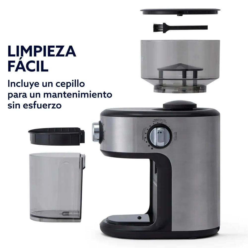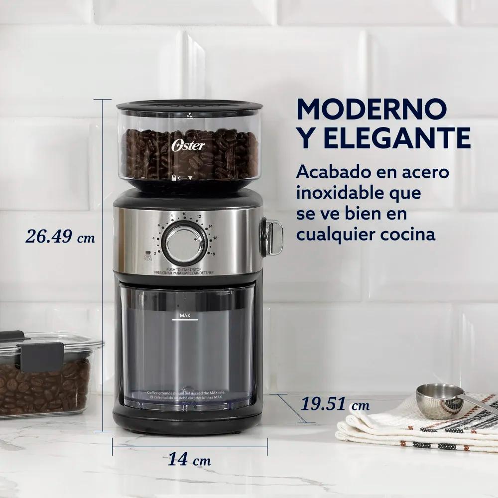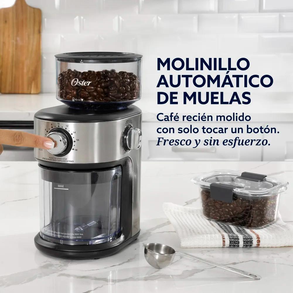 El Molinillo de Café Automático de Muelas Oster muele los granos justo antes de preparar cada taza con solo presionar un botón, para conservar el aroma, el sabor y la frescura del café recién hecho. Con 18 configuraciones, solo se elige el tipo de molienda y listo: gruesa para prensa francesa, media para cafetera de goteo o fina para un espresso. Se adapta a cada gusto y forma de prepararlo, para que cada taza tenga el mejor sabor. Además, el selector de 2 a 18 tazas es perfecto para moler solo lo necesario, sin desperdiciar. La tolva extraíble de 227g hace que llenarlo y limpiarlo sea muy fácil, y sus muelas de alta calidad aseguran una molienda uniforme en todo momento. Su diseño en acero inoxidable da un toque moderno a la cocina. Y para mantenerlo siempre en buen estado, incluye un cepillo que facilita la limpieza del día a día.