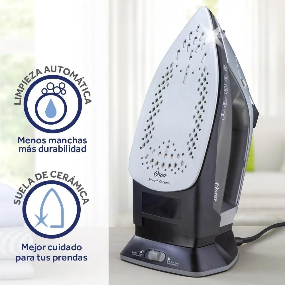 La plancha de cable inalámbrica Oster, te brinda un excelente planchado, con máxima comodidad. No más cables estorbando a tu paso. Simplemente, la levantas de la base y puedes planchar libremente en la dirección que gustes. Esta plancha, además cuenta con funciones que hacen el planchado más fácil. Su base de cerámica es de un material inorgánico que tiene la propiedad de resistencia a la corrosión y abrasión, además de su alta durabilidad.